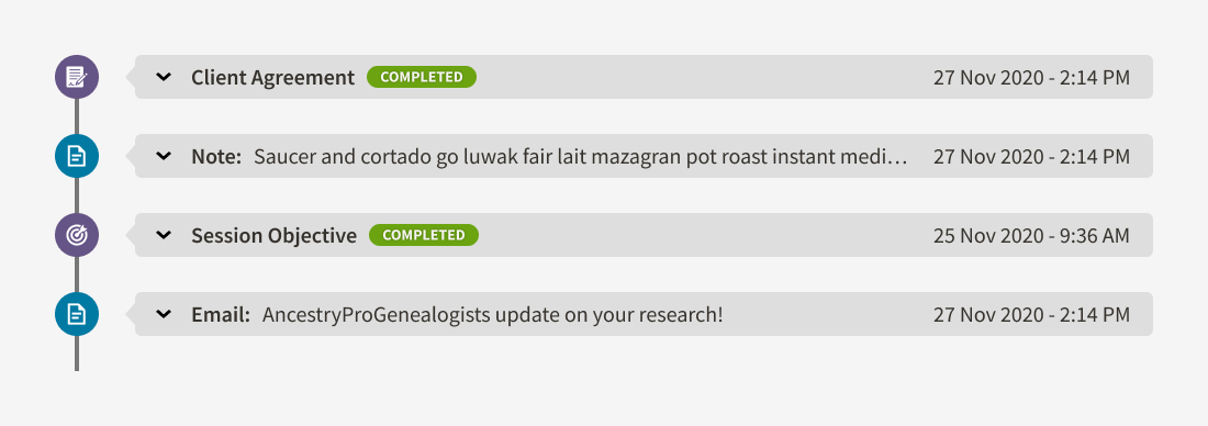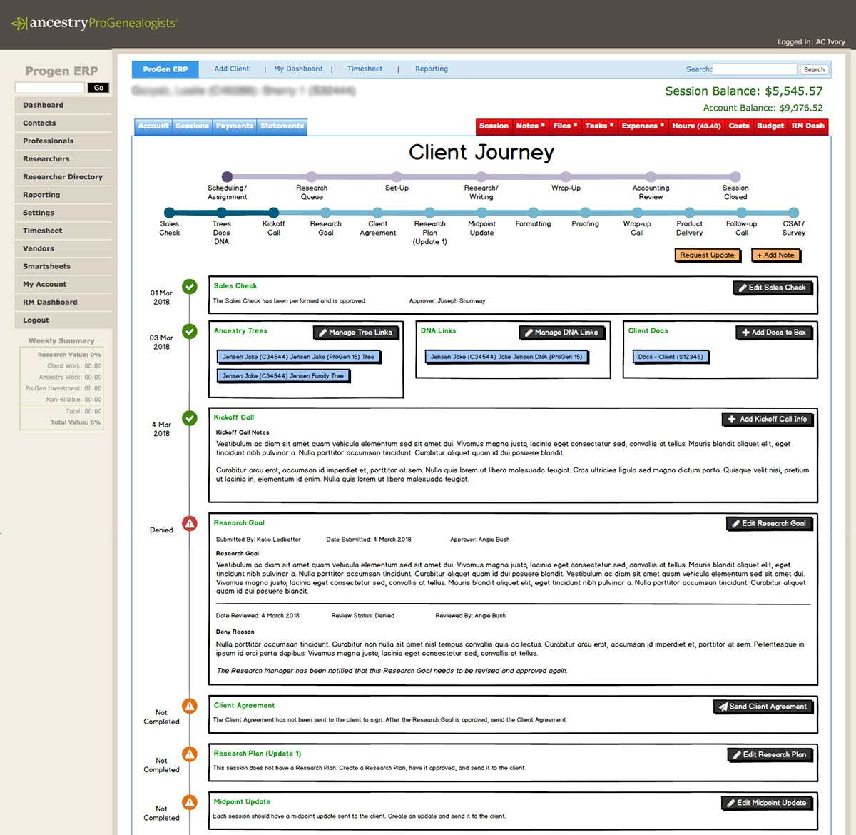 As UX Designer at Ancestry, I led experience design for a custom ERP/CRM unifying client, project, timekeeping, and billing workflows for AncestryProGenealogists—the world's largest genealogical research firm with over 80 genealogists. I ran discovery with researchers, project managers, sales, and finance to map client journeys and SOPs, then designed standardized milestones, dashboards, and communication timelines that improved visibility and consistency at scale. I partnered with engineering on data models, feasibility, and phased rollout for a modern, accessible UI.