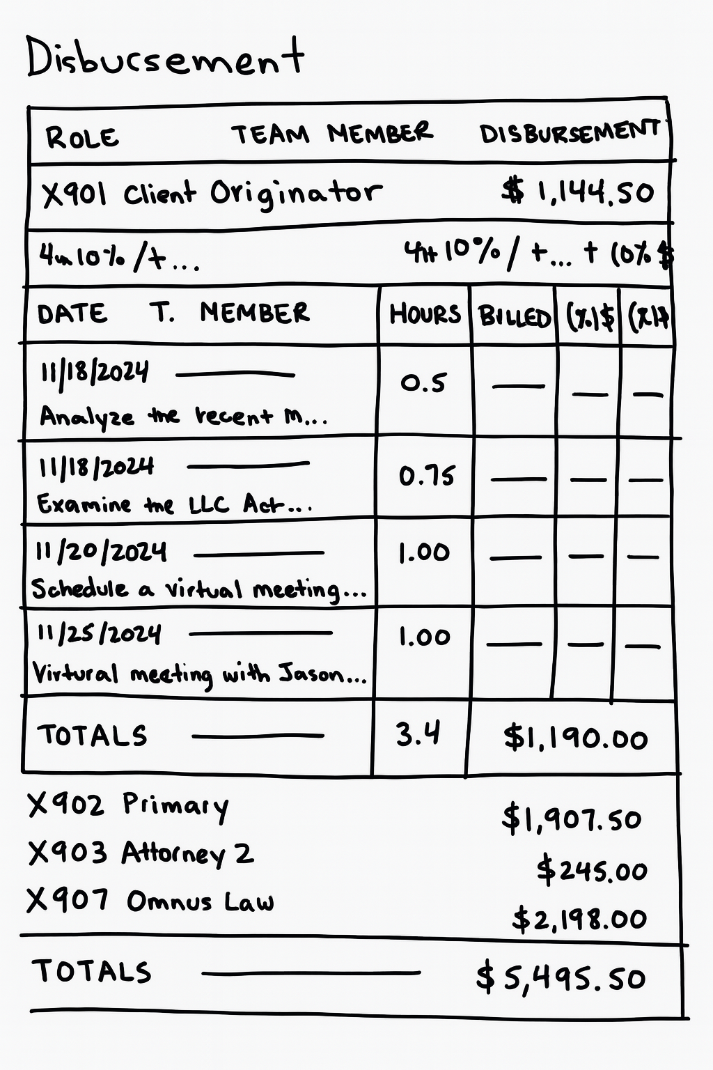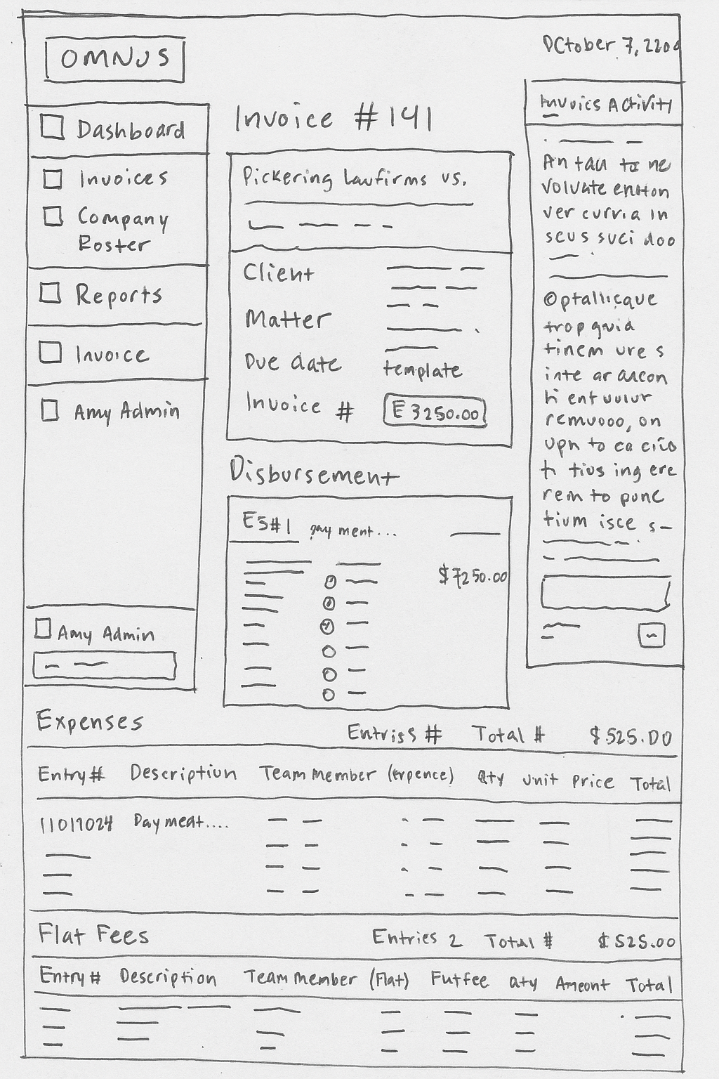 Early wireframes explored consolidating client, timesheet, and disbursement data on a single Invoice page.