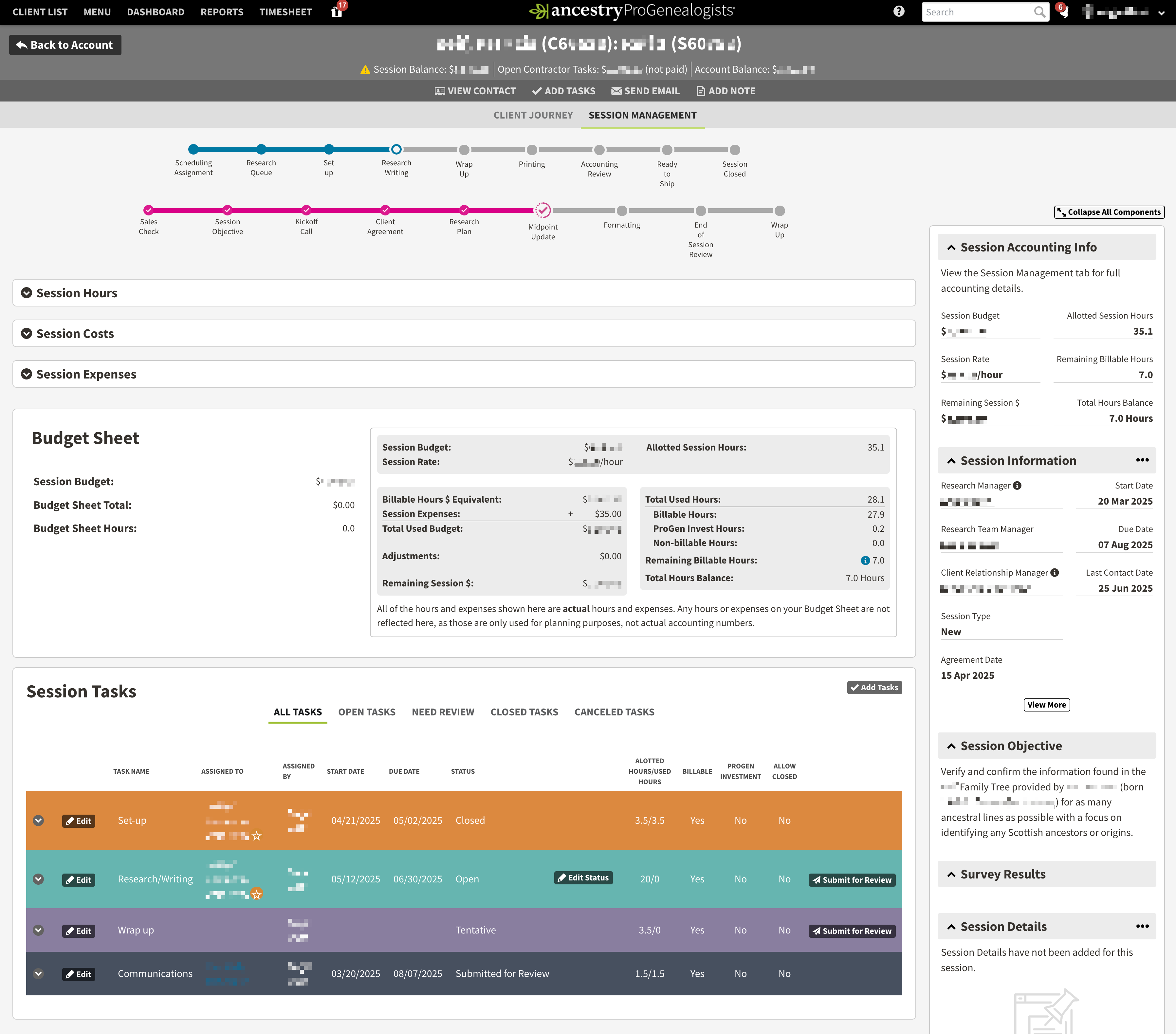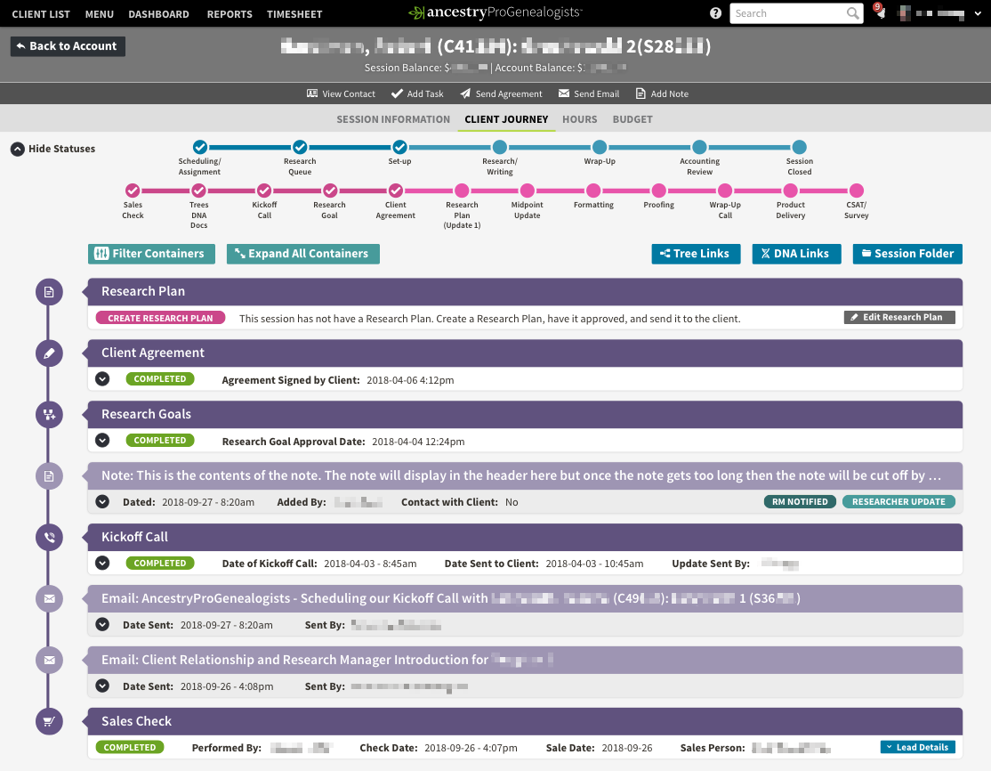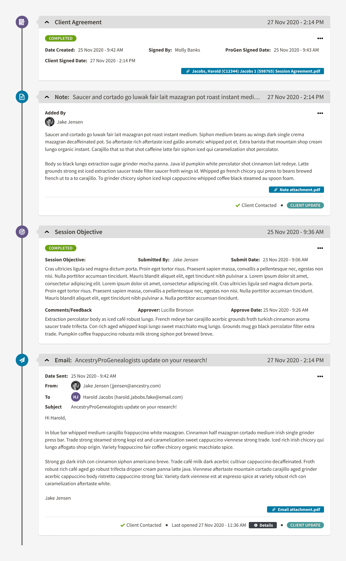 As UX Designer at Ancestry, I led experience design for a custom ERP/CRM unifying client, project, timekeeping, and billing workflows for AncestryProGenealogists—the world's largest genealogical research firm with over 80 genealogists. I ran discovery with researchers, project managers, sales, and finance to map client journeys and SOPs, then designed standardized milestones, dashboards, and communication timelines that improved visibility and consistency at scale. I partnered with engineering on data models, feasibility, and phased rollout for a modern, accessible UI.